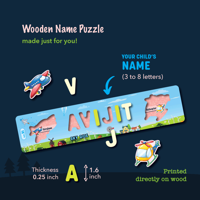 Dive deeper into the sky and space with our “Sky Ride” name puzzle. It's not just captivating on the surface. As your child removes pieces from the top layer, they'll uncover a colorful bottom layer featuring a variety of aircraft and spacecraft against a red backdrop, adding to the fascination. This thrilling surprise keeps them engaged and enhances the joy of learning.