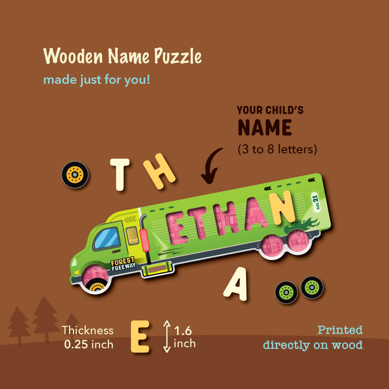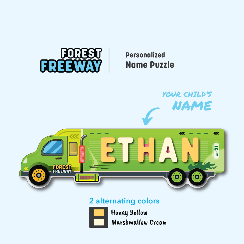 COLOR theme: Welcome to the "Forest Freeway" name puzzle, crafted like a van to ignite imaginative speed in a lush green forest! The top layer showcases a vibrant green van with thrilling details, while the bottom layer depicts cars zooming around the city against a high-contrast purple backdrop. The puzzle features playful orange and yellow letters, with realistic front and rear wheels adding authenticity to the van design. Plus, a custom message can be printed on the yellow back as an additional option.