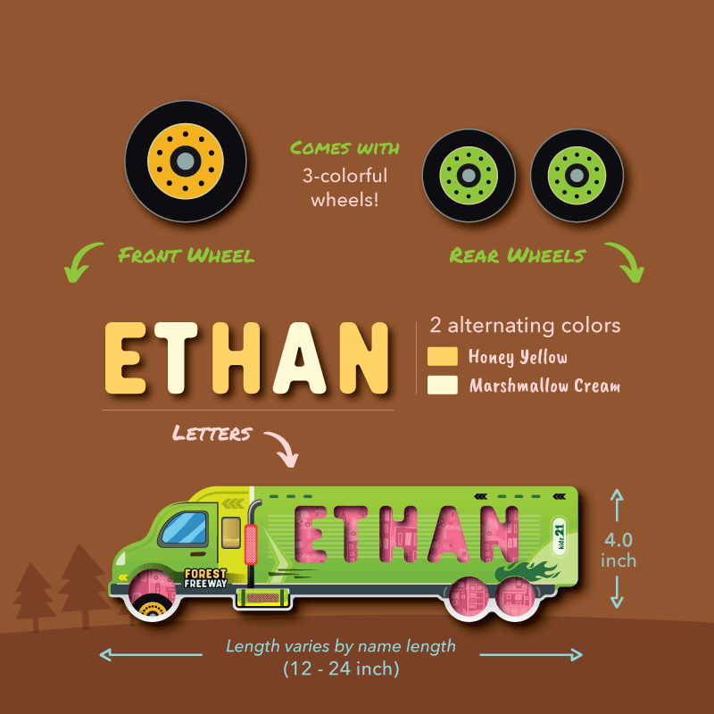 SIZE: Length - ranges from 10 to 20 inches, depending on name length (3 to 9 letters). Height: 4 inches. Thickness: 0.4 inches. Letters: 1.6 inches tall, 0.25-inch thickness. Cut-outs/Wheels: Front wheel is 1.6 inch diameter, rear two are 1.2 inch. All puzzle pieces are child-safe, thicker, easy to grab, and taller than the base of the top layer, making it comfortable to place them.